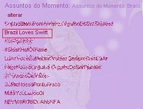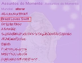 Na tarde de hoje, os fãs brasileiros da Taylor Swift se uniram para colocar a tag “Brazil Loves Swift” nos Trending Topics Mundiais e em menos de 1 hora a tag entrou nos Trendings do Brasil e logo depois nos Mundiais e em uma ótima posição. Vejam só as capturas de tela abaixo: