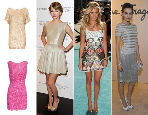 Taylor Swift, Ashley Tisdale e Camilla Belle Look para o dia a dia: O vestido retrô e com um leve brilho, de Taylor Swift, é ótimo para a gente se inspirar. Se quiser apostar em uma única peça toda de brilho, durante o dia, combine com um cardigã de cor clara e sapatilha, ou até um oxford para dar um quebrada no visual.