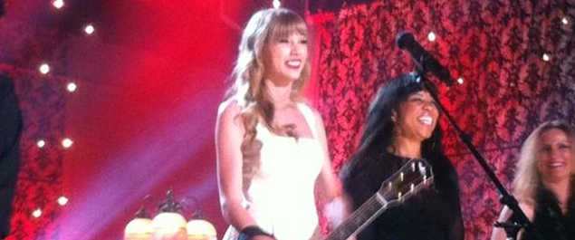 Em uma gravação excepcionalmente calma – houveram poucas pausas e sem paradas para retakes – Swift realizou o equivalente a uma veterana do estrelato pop nesta escola, que ganhou um concurso nacional para sediar um show da cantora e compositora. Ela se envolveu facilmente com um punhado de alunos selecionados para fazer perguntas, conversava com aqueles que trouxeram trabalhos artesanais proclamando sua devoção a estrela da noite, e compartilhou histórias com canções mais antigas, bem como algumas de seu quarto álbum prestes a ser lançado, “Red”, no dia 22 de outubro.