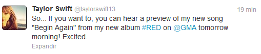 Então…Se vocês quiserem, vocês poderão ouvir um preview da minha nova música ”Begin Again” do meu novo álbum #RED no GMA amanhã de manhã! Animada!