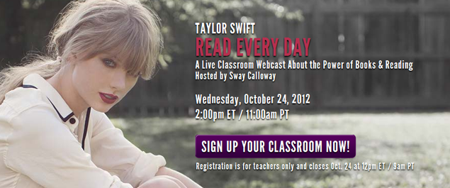 No dia 24 de outubro Taylor Swift participará de um webchat ao vivo com professores e associados a organização americana Scholastic em um projeto de incentivo à leitura nas escolas.