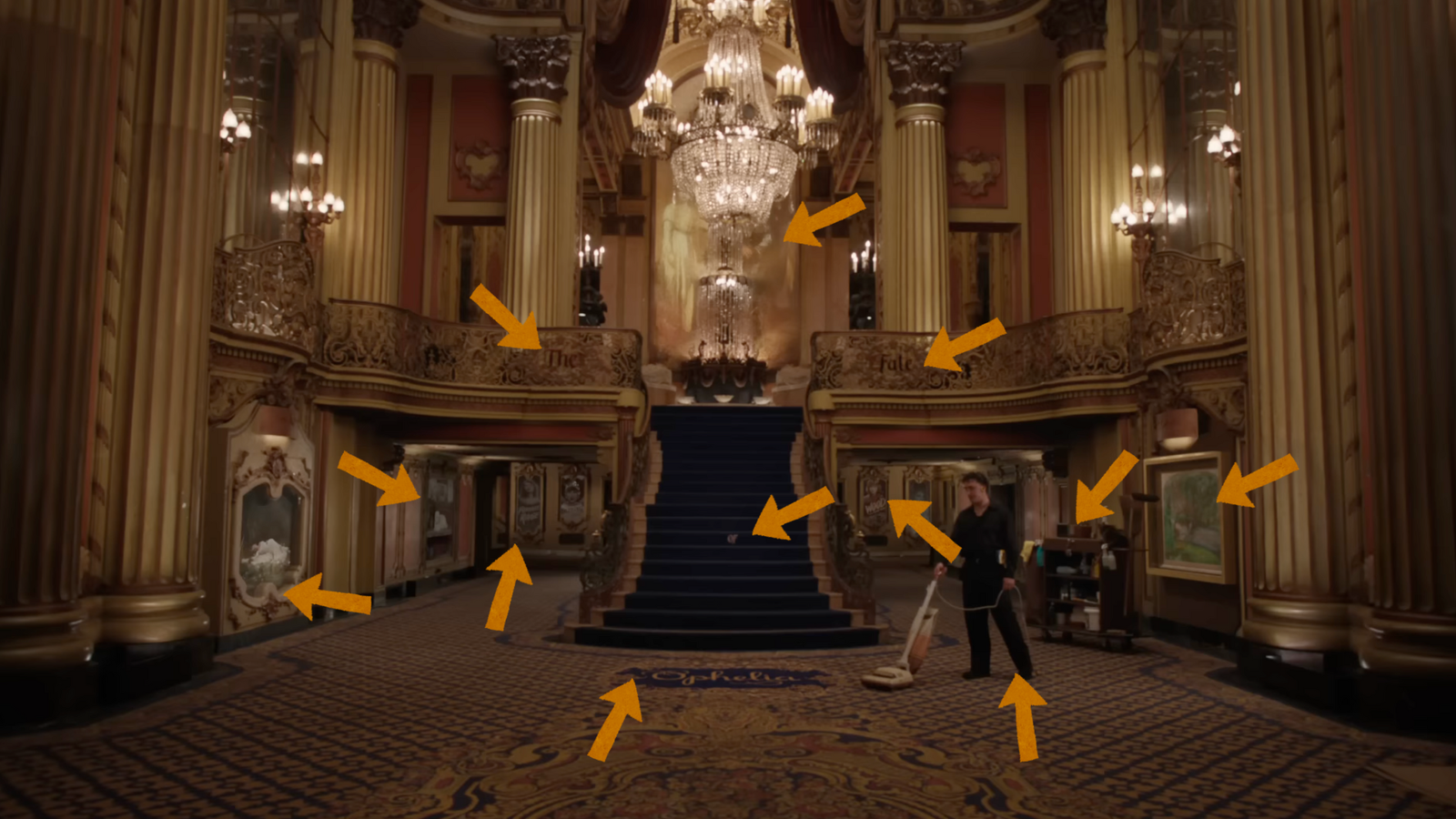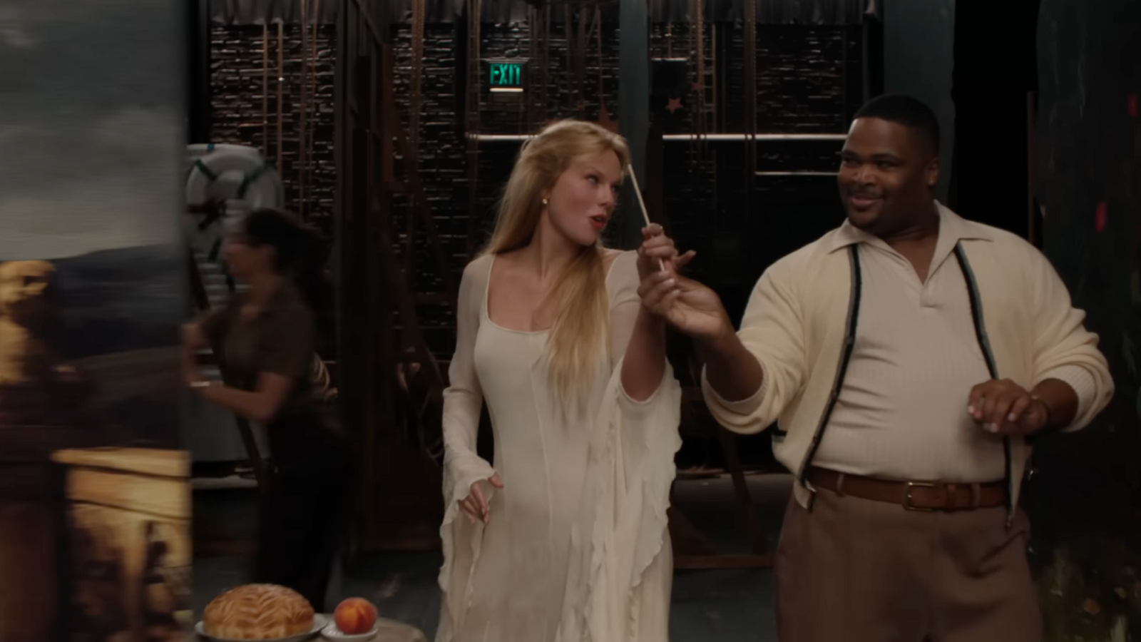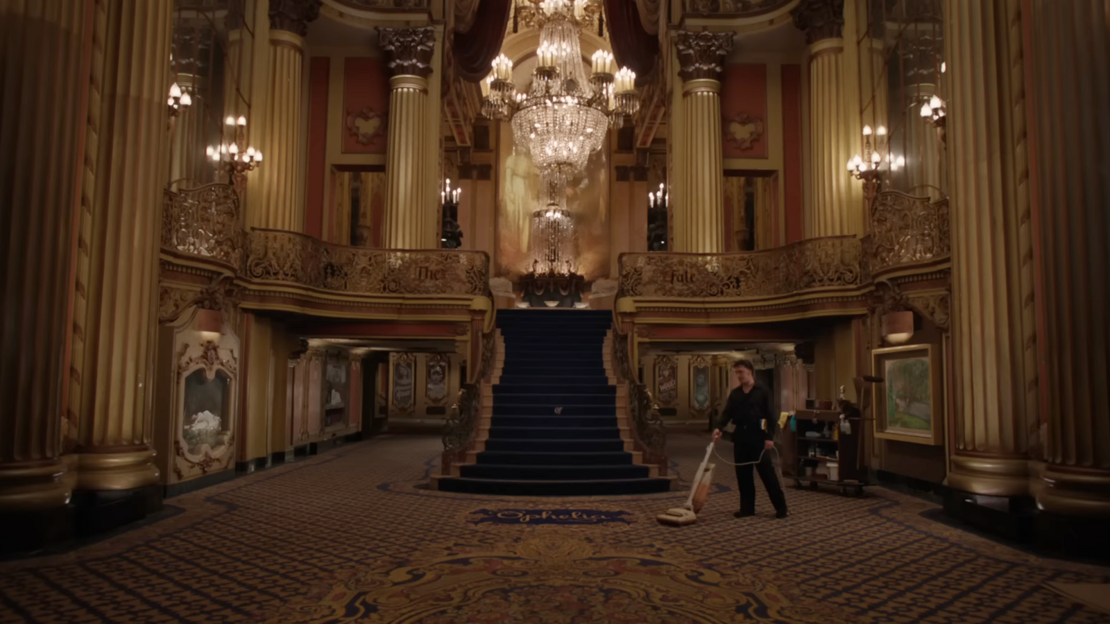 Logo de início, o clipe traz uma participação especial: Sam McWilliams, dançarino da The Eras Tour e figura querida entre os fãs, aspirando o carpete do teatro.