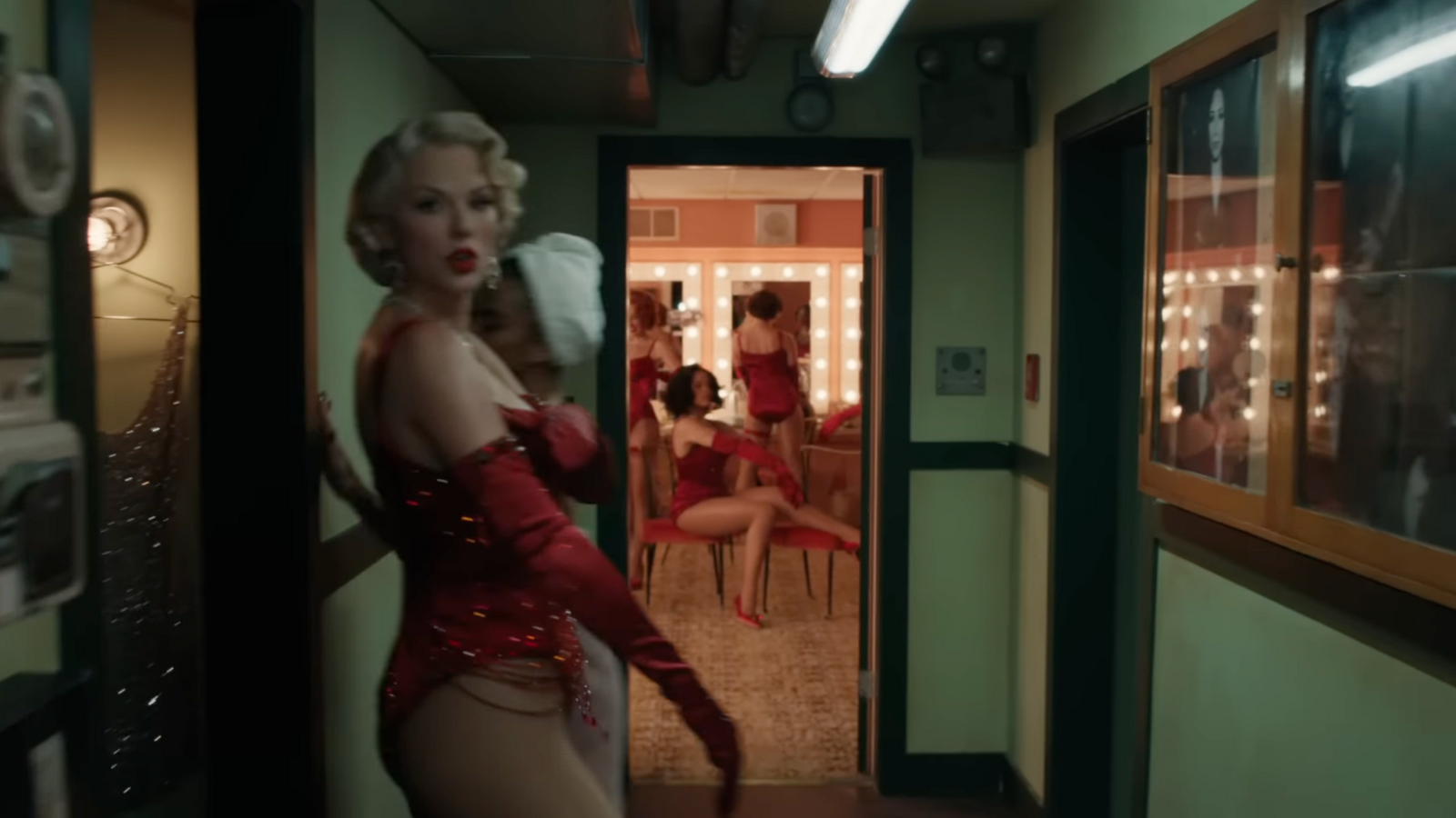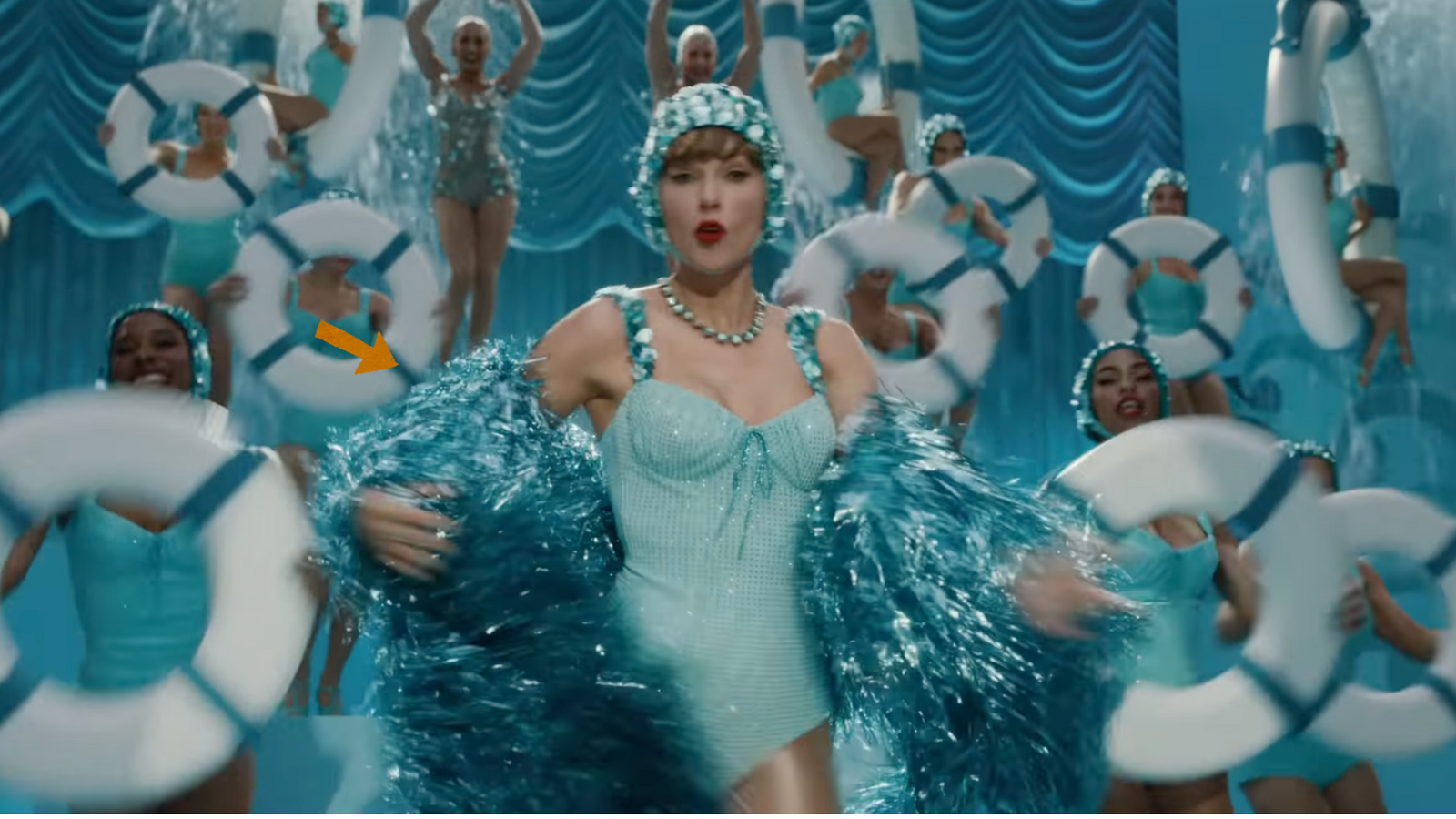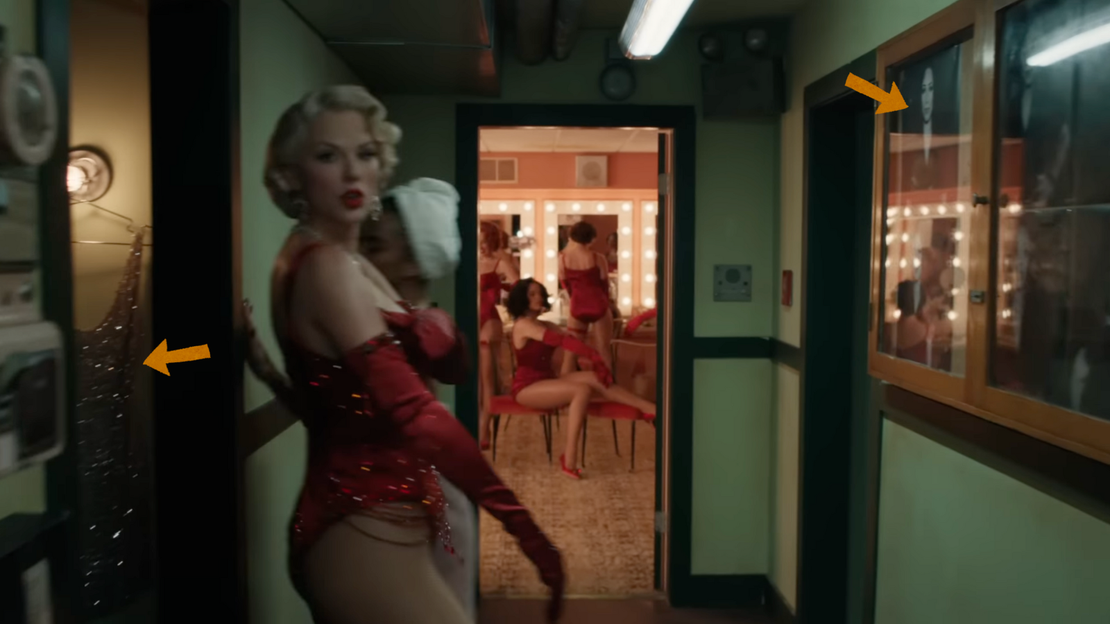 No primeiro take onde Taylor aparece caracterizada de Marylin Monroe, é possível encontrar dois easter eggs: Dentro do ármario, um vestido de tule transparente coberto em pedrarias, bem similar ao vestido usado pela atriz para cantar “Feliz Aniversário” ao presidente americano JFK em 1962. Do outro lado, temos headshots de todos os dançarinos da The Eras Tour, que vimos primeiro no Pop Up do Spotify no final de Setembro.
