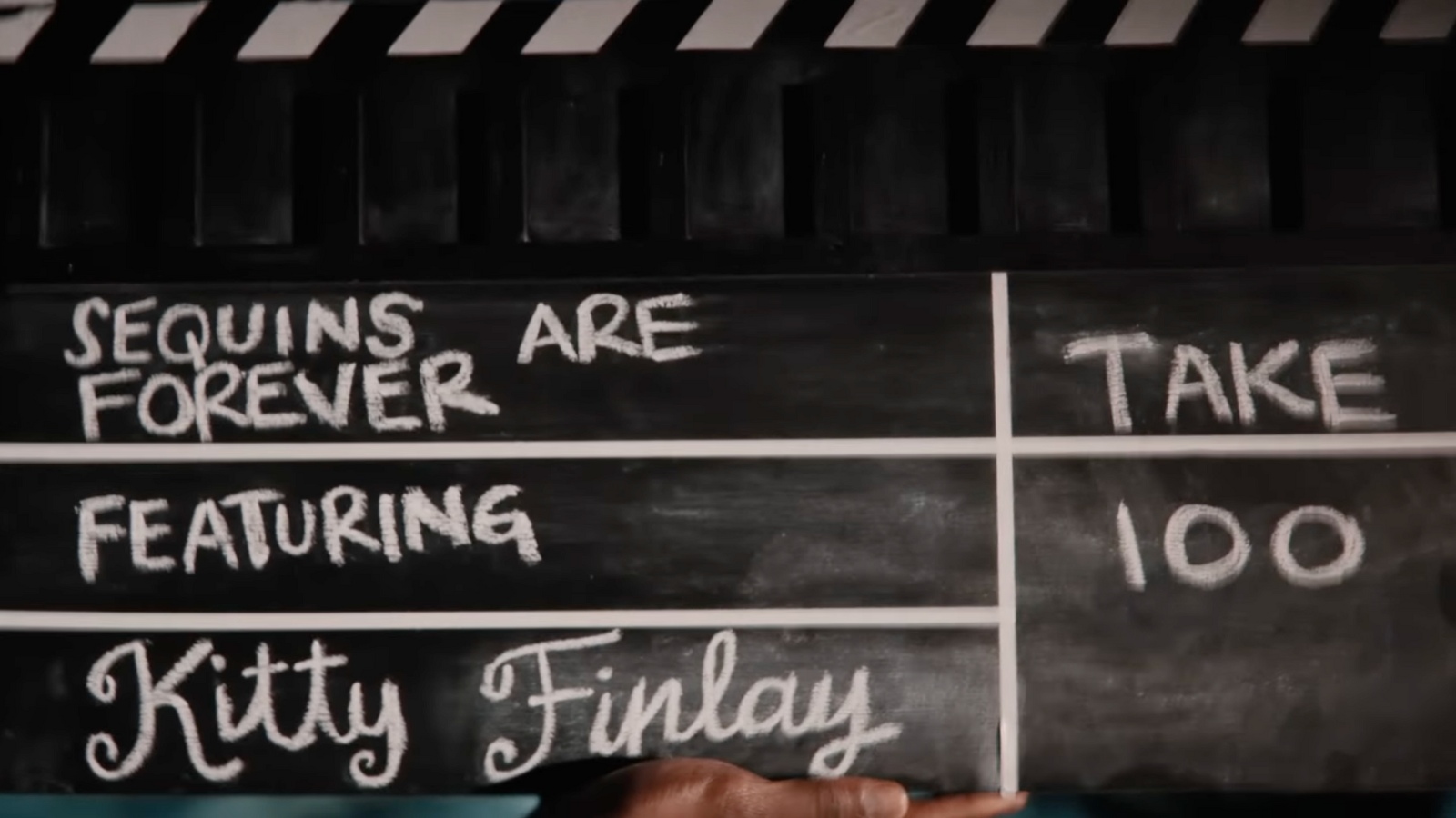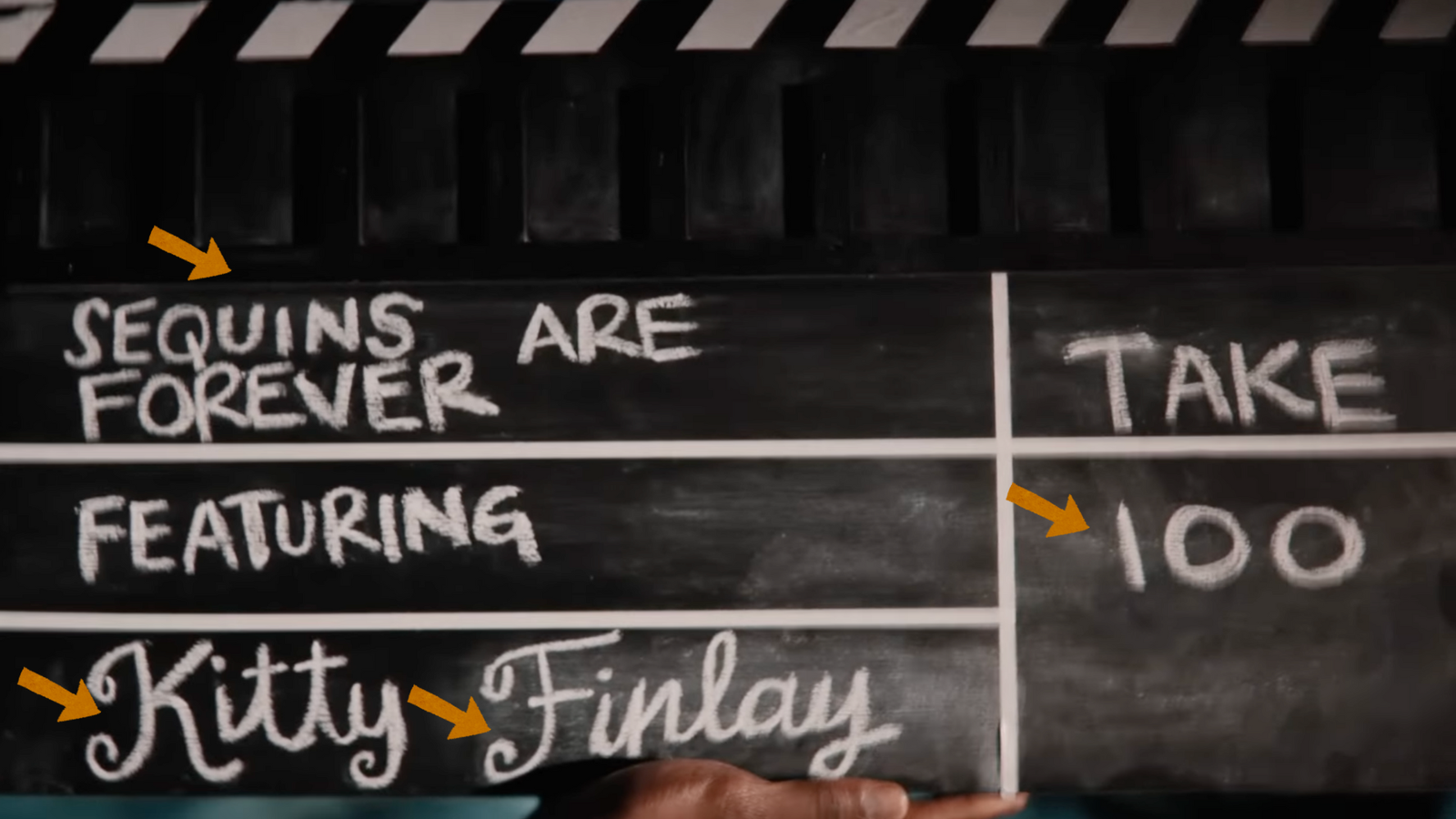 No claquete, podemos mais encontrar 3 easter eggs! “Sequins are forever” (lantejoulas são para sempre) também é uma referência a letra de The Life of a Showgirl. Kitty Finlay é o nome da cachorra de sua mãe, Andrea, e Finlay também é o sobrenome de sua avó, Marjorie. “Take 100” pode ser interpretado de duas formas: Uma referência a letra “Keep it 100” da música e a soma de 13 (número da sorte de Taylor Swift) + 87 (Número da camiseta de Travis Kelce no Chiefs)