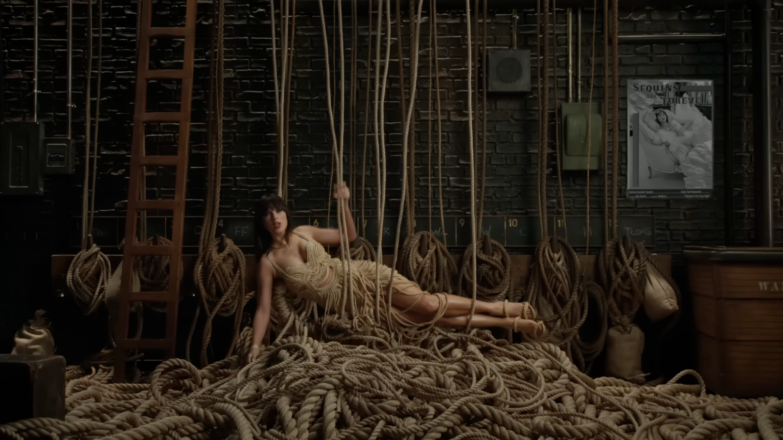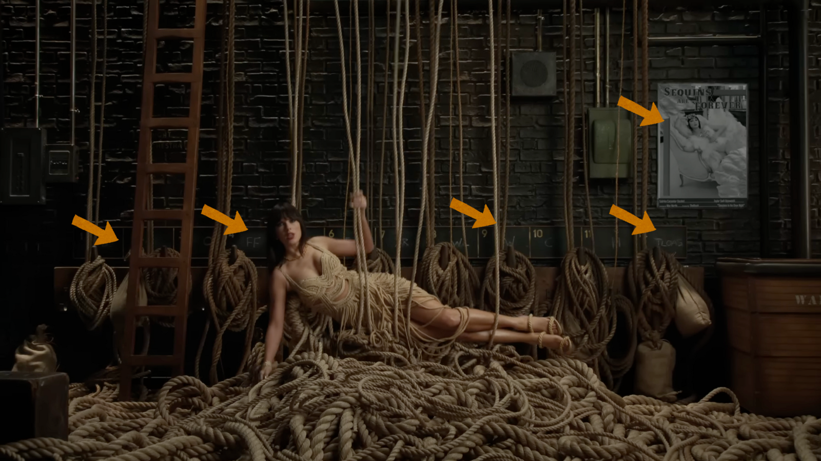 Nessa cena, podemos ver toda a tracklist do álbum abreviada pelas iniciais ao fundo de Taylor. Já no poster da parede, podemos ler novamente a frase “Sequins are forever” (lantejoulas são para sempre) e “Sleepless in the onyx night” (Sem dormir na noite de ônix), uma referência direta a música Opalite.