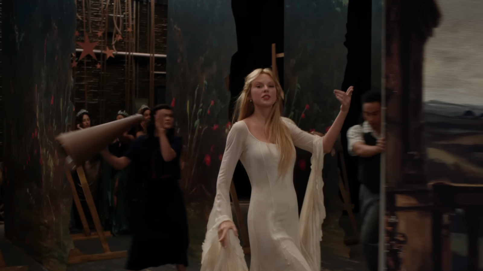 Atrás dele, é possível ver o quadro original de Ophelia e, do outro lado, uma releitura feita por Taylor Swift e um carrinho de limpeza, objeto que Taylor usava para entrar no palco da The Eras Tour sem que revelasse seu figurino do dia.
