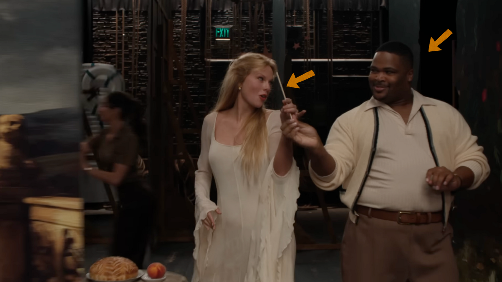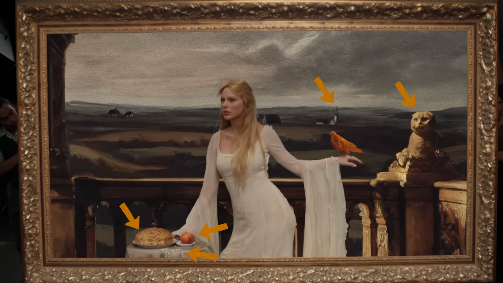 Nesse take, Taylor traz 5 easter eggs: A direita, podemos ver o busto em pedra da sua gatinha Olivia. Na mesa em frente dela, um pão de fermentação natural (Seu atual hobby favorito) ao lado de um pêssego e um colar de pérolas, uma referência a última faixa do álbum “The Life of a Showgirl” que conta com Sabrina Carpenter: “You’re sweeter than a peach” (Você é mais doce que um pêssego) e “I took her pearls of wisdom, hung them from my neck” (Eu peguei suas pérolas de sabedoria, pendurei-as no meu pescoço). Ao fundo, podemos ver uma miniatura da Estátua da Liberdade.