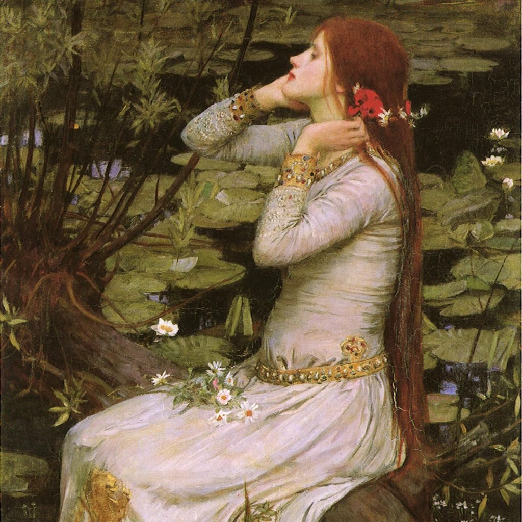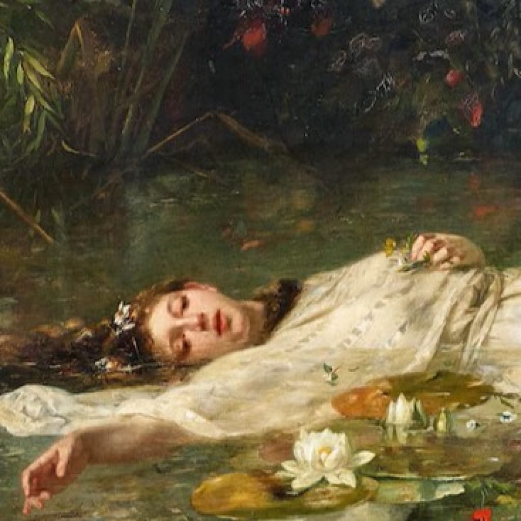 A referência é direta: O vestido branco, o cenário com água e flores, e o olhar distante remetem às pinturas que imortalizaram a personagem, especialmente as de John Everett Millais e John William Waterhouse.